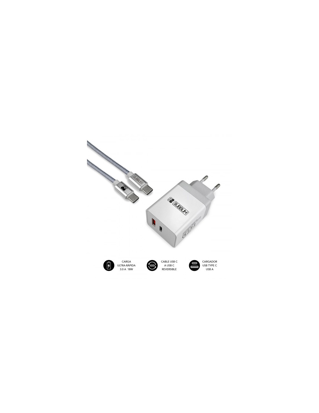CARGADOR USB SUBBLIM 18W 2.4A USB + USB-C SILVER PARA CASA + CABLE USB-C